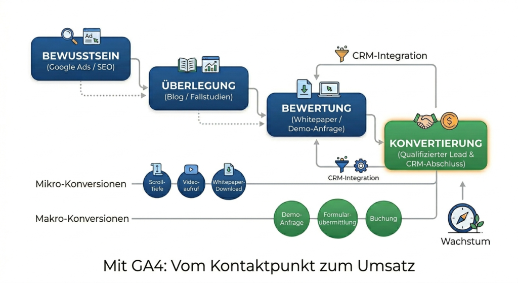 Google Ads → Website → Whitepaper → Retargeting → Demo-Anfrage → Vertriebsgespräch.