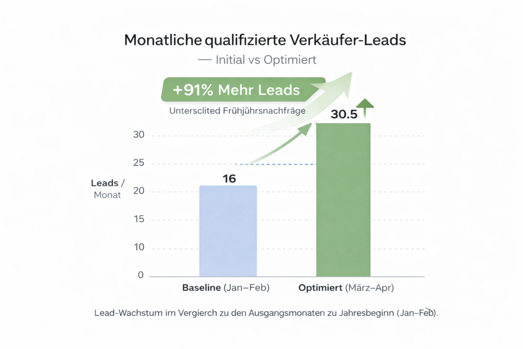 Innerhalb weniger Monate konnte die Kampagne deutlich mehr qualifizierte VerkÀufer-Leads generieren, wÀhrend die Kosten pro Lead gleichzeitig effizient kontrolliert wurden.